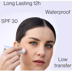 Resistente all’acqua, low transfer, SPF 30, long lasting 12h. Testato non comedogeno