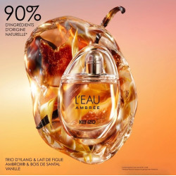 Formulata con il 90% di ingredienti di origine naturale**, L`Eau Ambrée è presentata in una bottiglia riutilizzabile interamente in vetro***. La scatola esterna è in carta. Ingredienti provenienti da fonti responsabili, a testimonianza dell`impegno di KENZO per un mondo più bello.