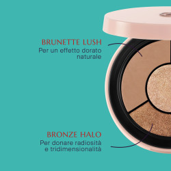 - Mixare Brunette Lush Bronze Halo ed applicarli sulle palpebre e sul viso come terra illuminante;